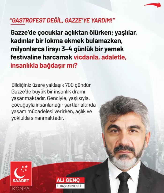 Saadet Partisi Konya İl Başkanlığı, Gazze’de yaşanan insanlık dramına dikkat çekerek milyonlarca liranın yemek festivallerine harcanmasını sert bir dille eleştirdi. İl Başkan Vekili Ali Genç, yaptığı açıklamada vicdan, adalet ve insanlık çağrısında bulundu.
