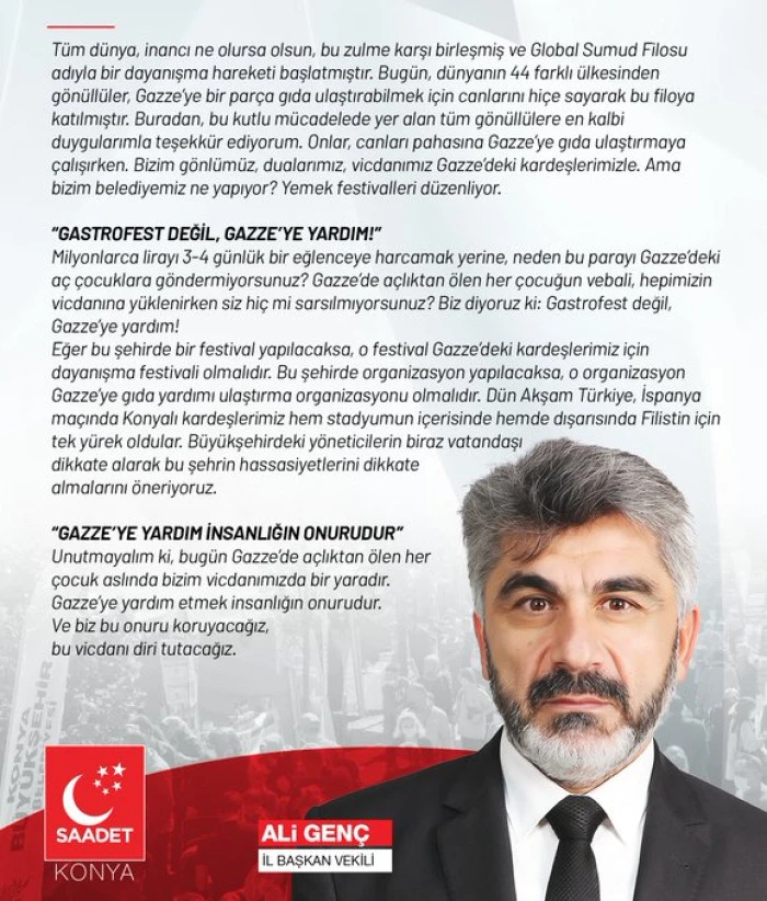 Saadet Partisi Konya İl Başkan Vekili Ali Genç, festivallerin eğlence amacıyla yapılacağına, Gazze’ye yardım organizasyonuna dönüştürülmesi gerektiğini ifade ederek şu çağrıyı yaptı: