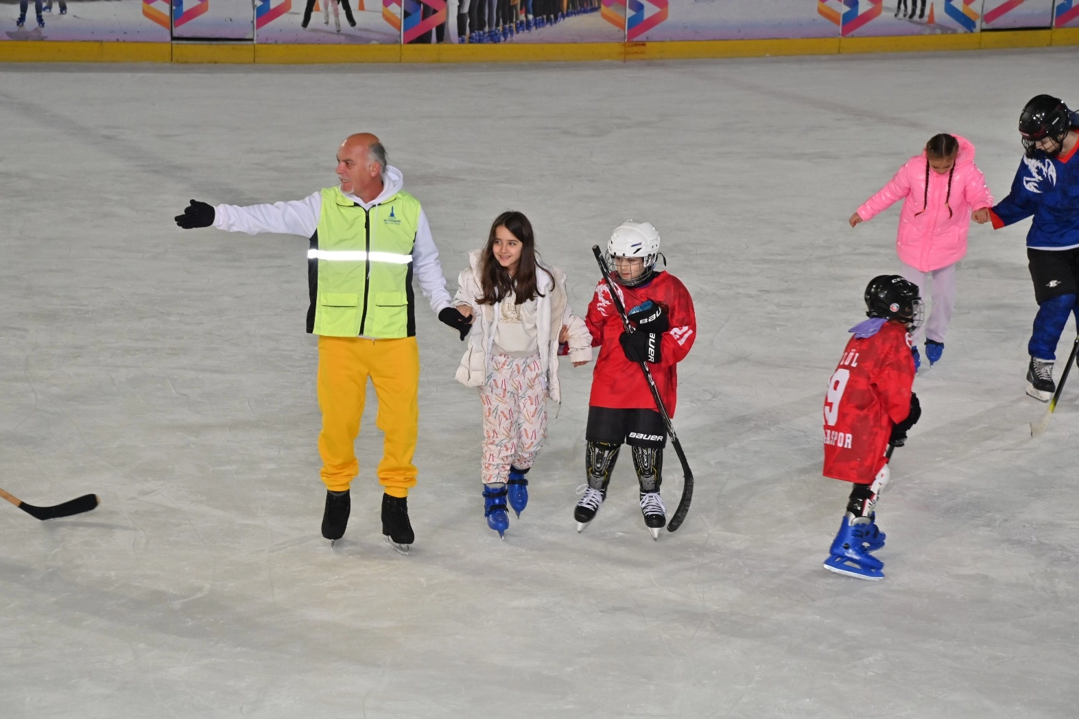 İlk kez buz pistine çıkan 150 çocuğa, uzman antrenörler eşliğinde temel ve teorik eğitim verildi.